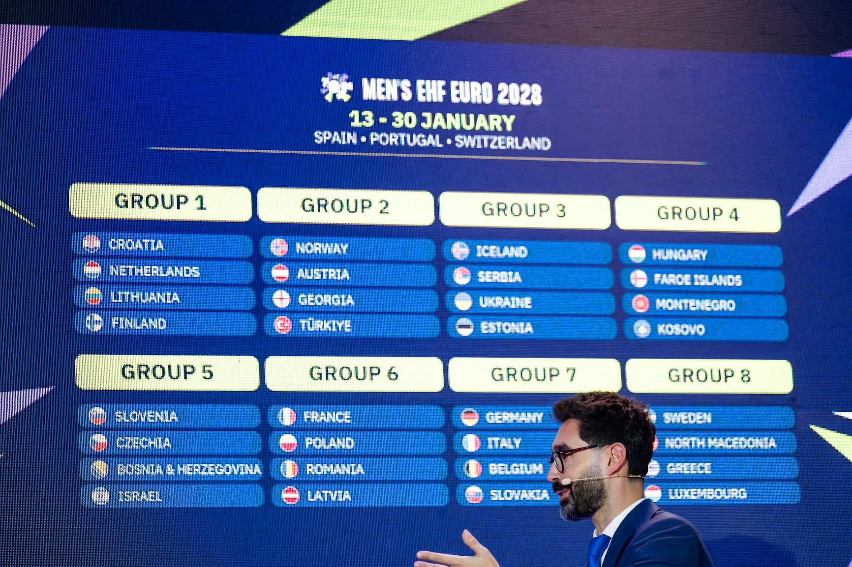 Finalinis turnyras, kuriame žais 24 rinktinės, vyks 2028 m. sausio 13-30 d. Portugalijoje, Šveicarijoje ir Ispanijoje. Trys šeimininkės bei čempionų titulą ginsiantys Danijos rankininkai, jau užsitikrinę vietas 18 kartą vyksiančiame Europos čempionate.