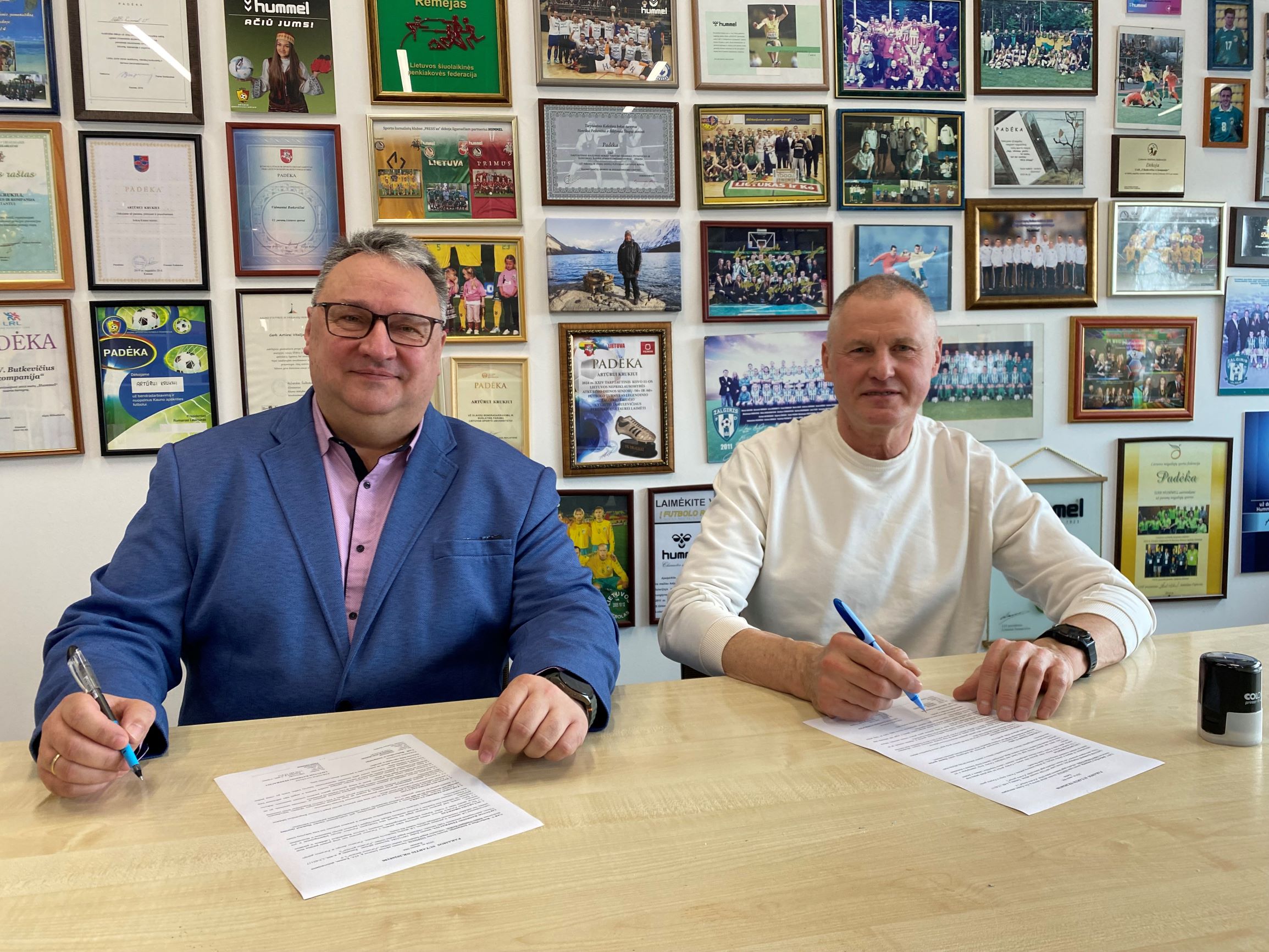 Naują bendradarbiavimo sutartį pasirašė LRF prezidentas Tadas Jansonas ir Danijos aprangos gamintojo „hummel“ atstovybės Lietuvoje vadovas Artūras Krukis.