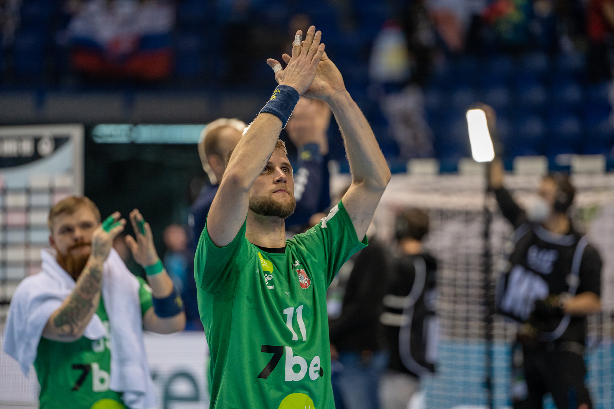 „Norėčiau kreiptis į Lietuvos sirgalius. Rinktinei ne visada sekasi ir ne visada laimim, bet norėtųsi, kad sirgaliai visada palaikytų Lietuvos rinktinę, nes mes tikrai atiduodam visas jėgas. Blogai atrodom kai patiriam skaudžius pralaimėjimus, bet tikrai stengiamės tiek, kiek galim. Tikrai nei vienas nesitaupom ir atiduodam visą 100 procentų jėgų ir aikštelėje esame pasiruošę numirti už Lietuvos rinktinę“, – emocingai kalbėjo G. Morkūnas.